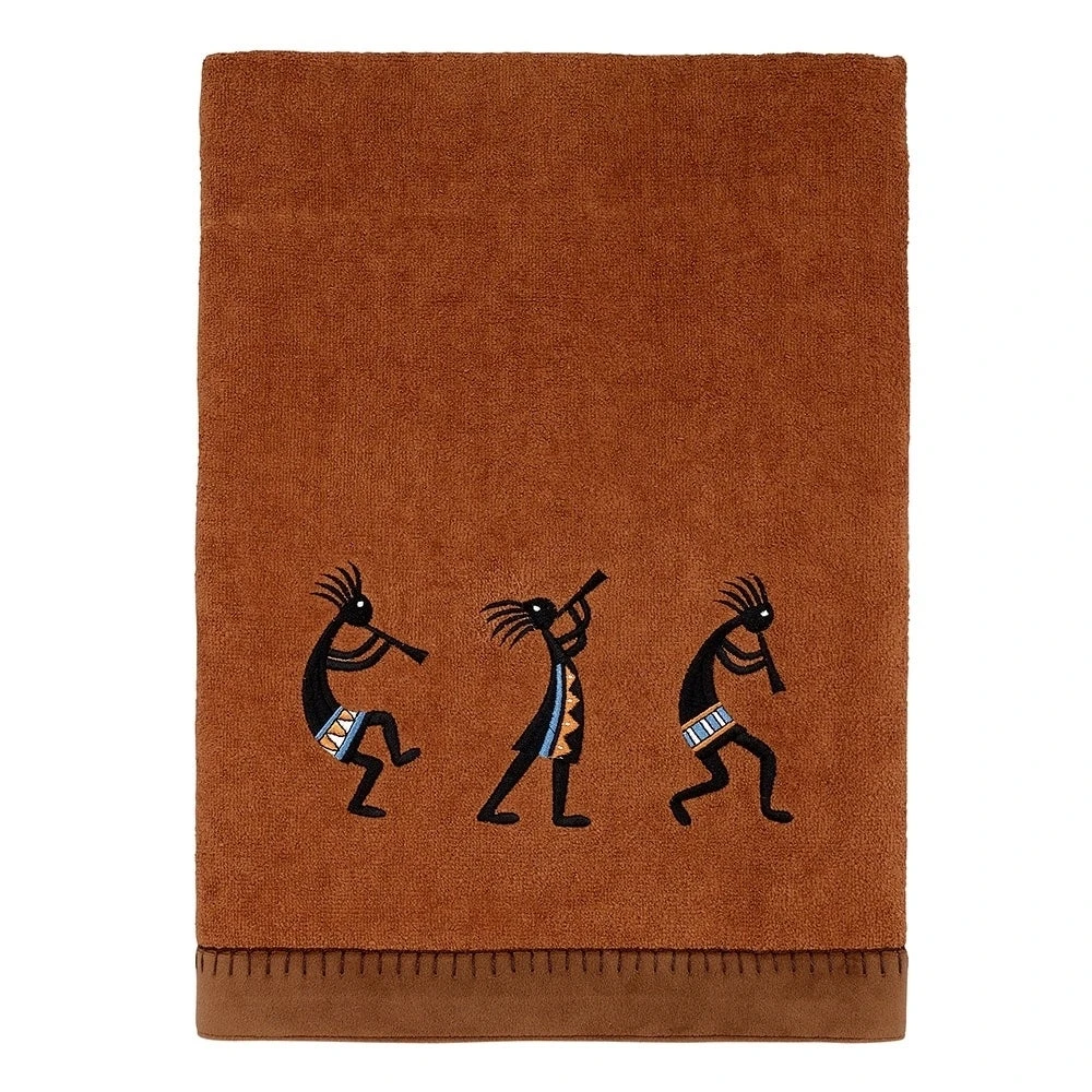 The Avanti Zuni Decorative Bath Towel features 3 colorful embroidered Kokopellis playing their flutes on a 100% cotton copper towel with coordinating sueded fabric border along the bottom. Embroidered in the USA, towel imported.